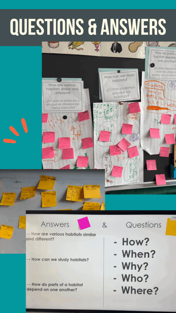 Keep the questions – and students’ initial ideas – posted throughout the unit! I love to create a living “working wall” or “inquiry wall.” These highlight the essential questions and act as a growing scrapbook for learning throughout the inquiry-based unit. Make sure to read more here about what you can include!